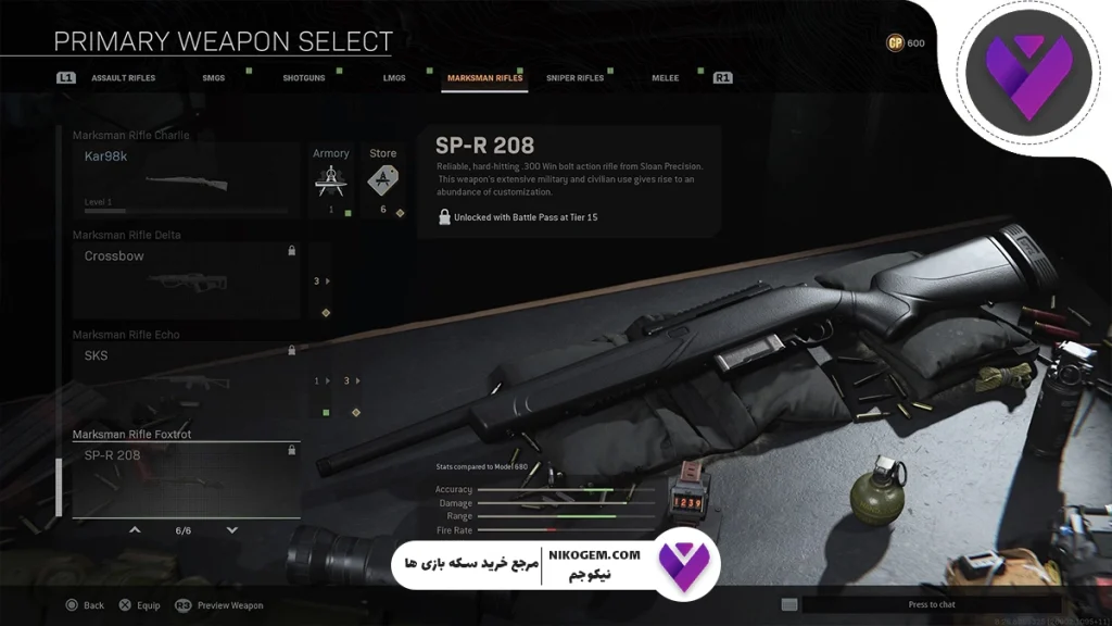 SPR-208 یک Marksman Rifle با دقت و قدرت بالا است که می‌تواند دشمن را تنها با یک شلیک دقیق از پا درآورد. این سلاح به دلیل سرعت بالا در ADS (نشانه‌گیری سریع) و برد زیاد، برای بازیکنان حرفه‌ای که علاقه‌مند به نبردهای میان‌بُرد و بلندبُرد هستند، یک انتخاب فوق‌العاده محسوب می‌شود.
