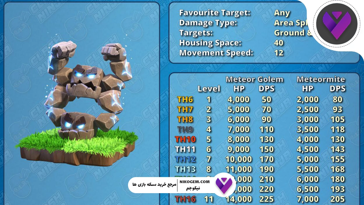 ترکیبی از بربر و آرچر که امکان حمله همزمان نزدیک و دور را فراهم میکند و برای پاکسازی ساختمانهای کوچک بسیار مفید است. - Meteor Golem (گولم شهابسنگ):