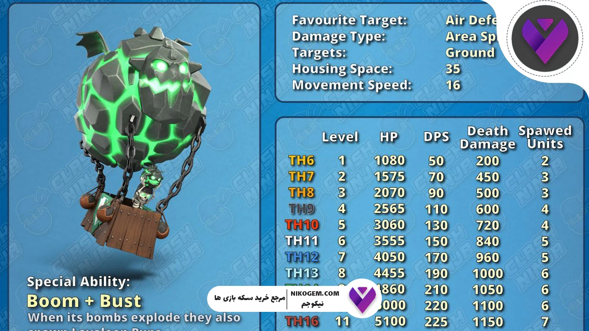 واحد هوایی کوچک که میتواند نیروها و ساختمانهای دشمن را بهطور موقت منجمد کند. - Lavaloon (لاواشار):